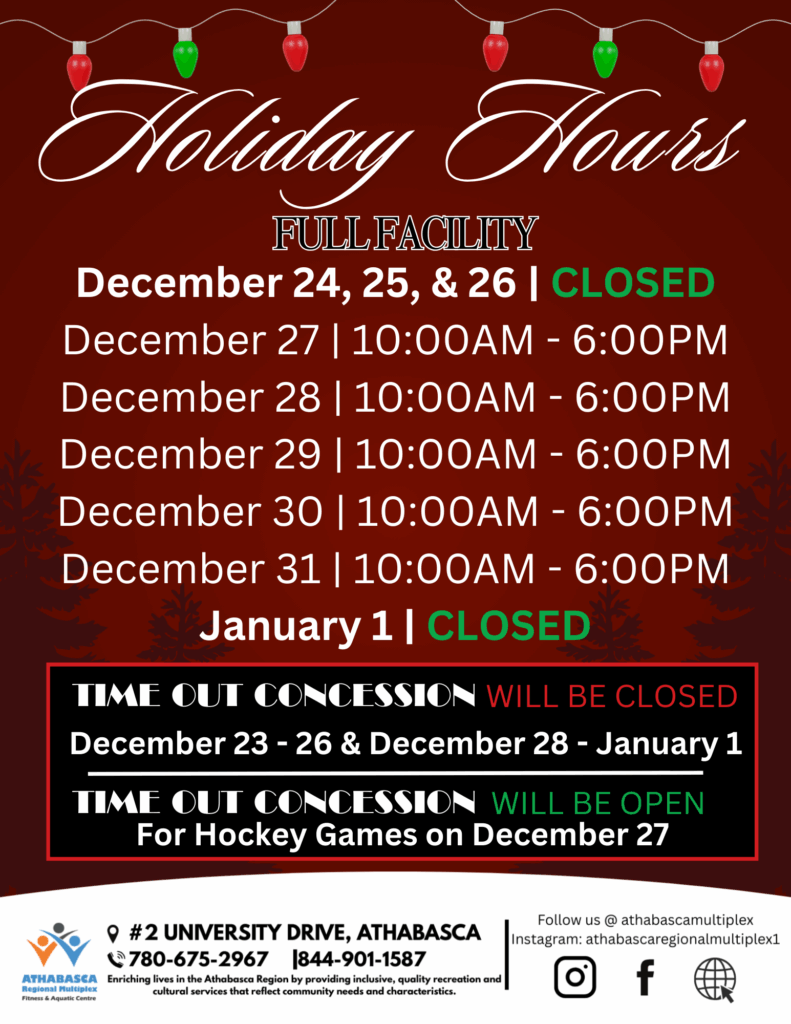 The Athabasca Regional Multiplex Fitness & Aquatic Centre will be CLOSED December 24-26 & January 1. We will be on Holiday Hours December 27-December 31.
