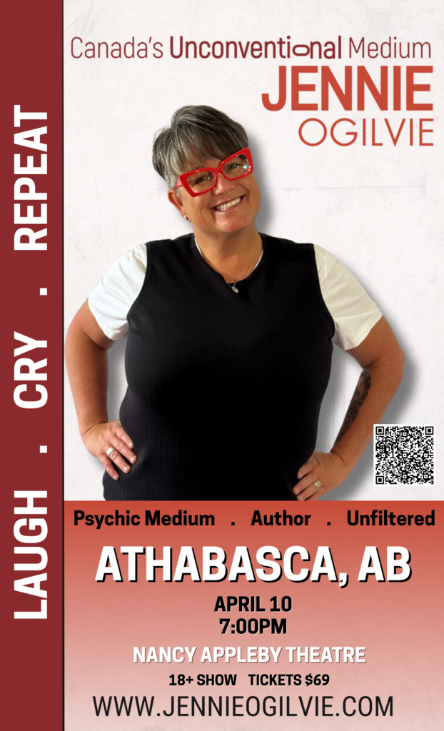 The Unconventional Medium Jennie Ogilvie returns to the Nancy Appleby Theatre on April 10th! Get your tickets at https://www.eventbrite.ca/e/canadas-unconventional-medium-jennie-ogilvie-live-in-athabasca-ab-tickets-1979626144087?aff=oddtdtcreator.